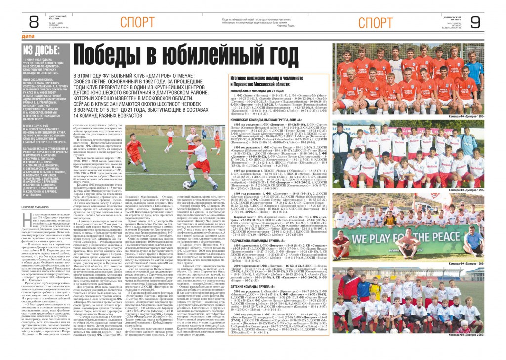 Хочется отметить, что футбольный клуб «Дмитров» выступал и выступает с инициативой по активному и массовому вовлечению детей и молодежи к занятиям этим замечательным видом спорта. На протяжении 20 лет пришлось решать много разных проблем, и вот клуб состоялся, он существует и живет интересной спортивной жизнью. Детско-юношеские команды нашего клуба успешно выступают в городских, районных, областных, российских и международных соревнованиях, защищая честь нашего любимого города и района.